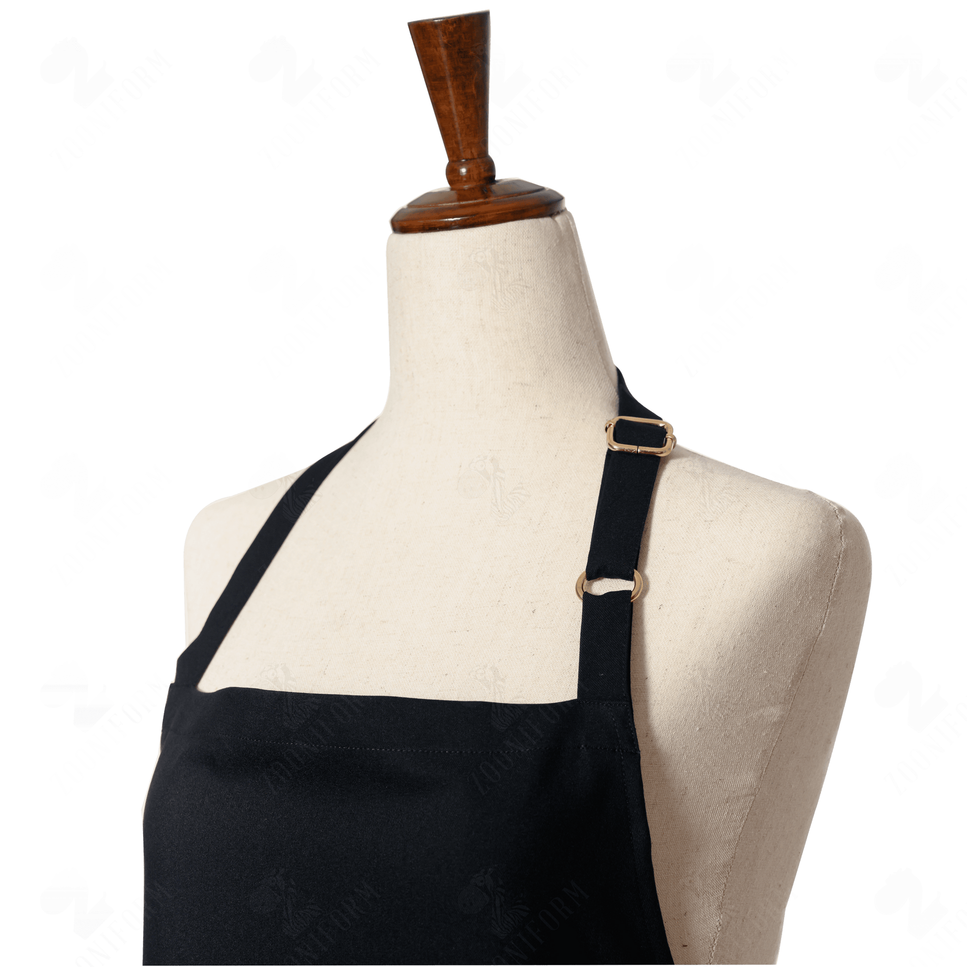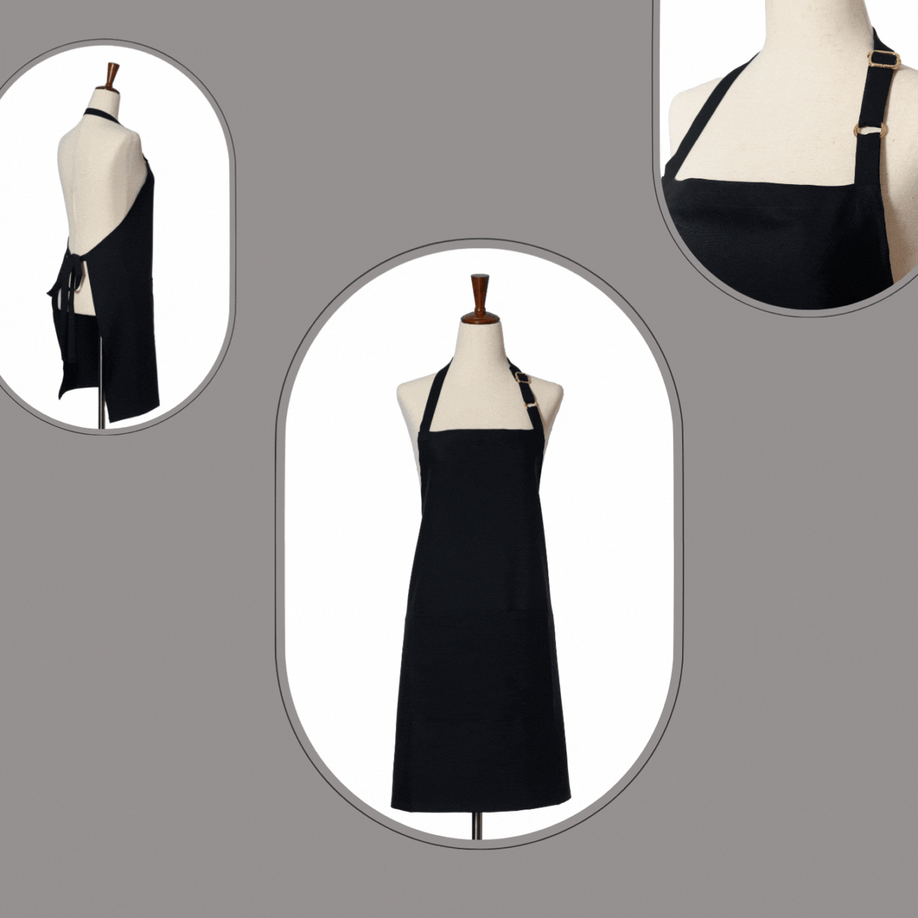 This Cotton Black Bib Apron has two generous pockets and an adjustable neck strap for a secure fit. The apron is made of a soft cotton material, providing comfort and long-term durability. The pocket design and adjustable neck strap make it ideal for kitchen work.